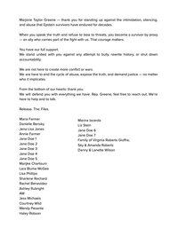 Sie verurteilen Versuche, einzuschüchtern, die Geschichte umzuschreiben oder Verantwortung zu unterdrücken, und schwören, den Kreislauf des Missbrauchs zu beenden, die Wahrheit ans Licht zu bringen und Gerechtigkeit zu fordern, egal wer darin verwickelt ist.