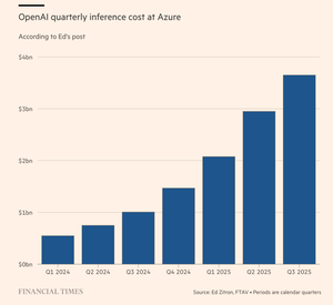 OpenAI の Azure 推論請求額は膨れ上がり、Ed Zitron が共有したデータの FT 分析によると、現在四半期あたり $4B に近づいています。 彼らの分析によると、過去 12.4 四半期で約 $7B が $MSFT の Azure 推論コンピューティングに費やされました。