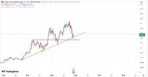 總市值目前仍保持在神奇的趨勢線上。仍需觀察是否能突破這一下降趨勢以轉為看漲。